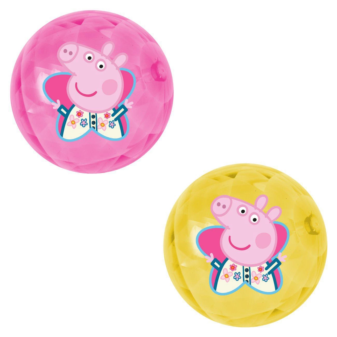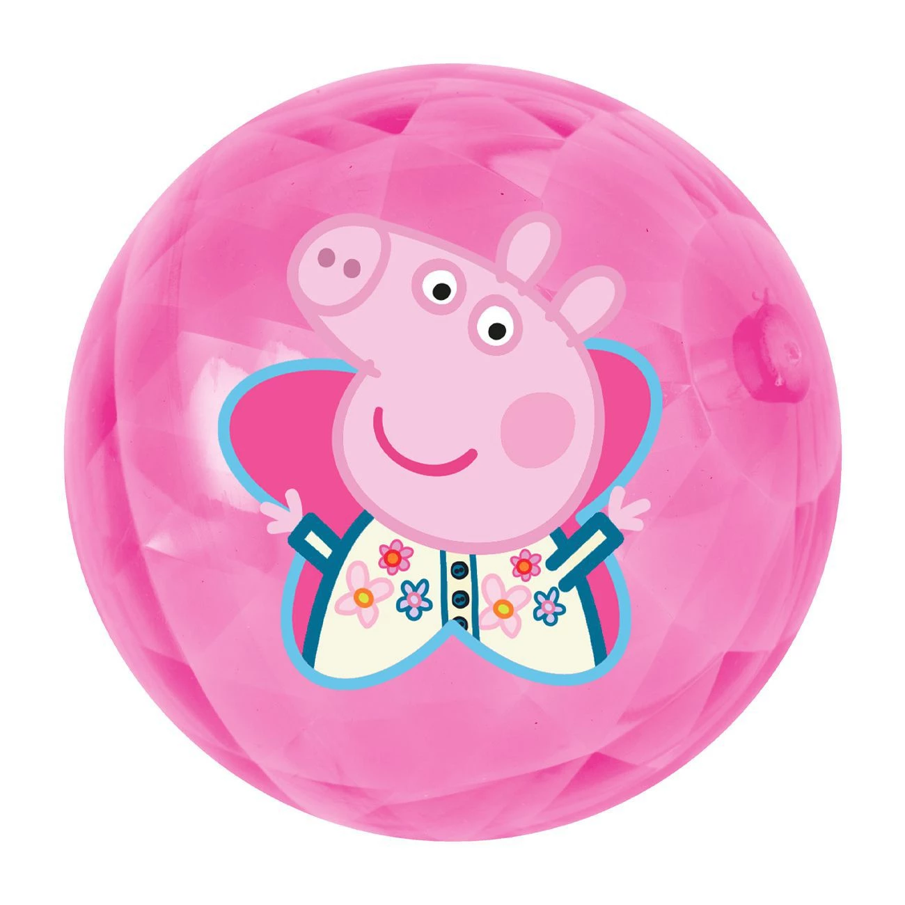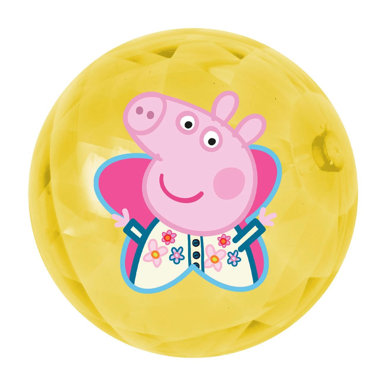 Žoga premera 10 cm, z led lučko. Zasveti in utripa, ko žoga udari v podlago. (sveti cca 10-12 sekund) Poslikana z motivi risane serije Peppa Pig. 12 kosov v škatli-displayu: 21x31x21 cm.