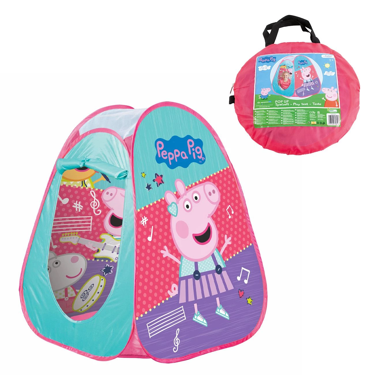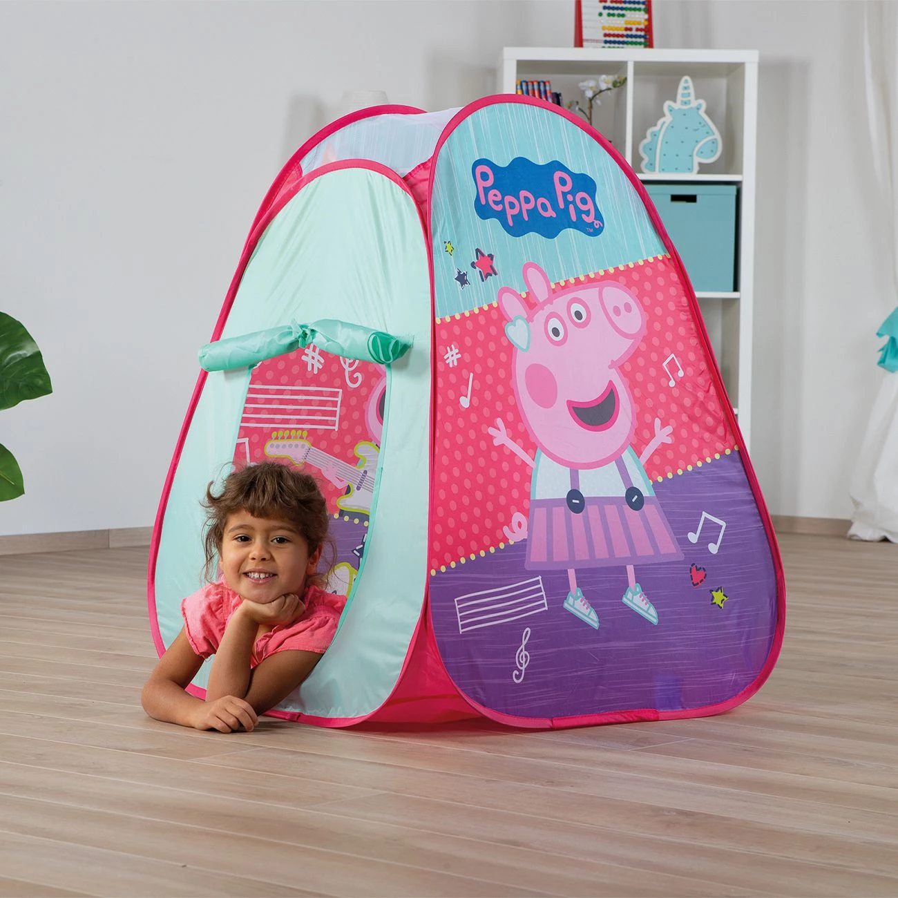 Šotor za igro v velikosti 75 x 75 x 90 cm. Poslikan z motivi risanega filma Pujsa Pepa. Primeren za zunanjo in notranjo uporabo.