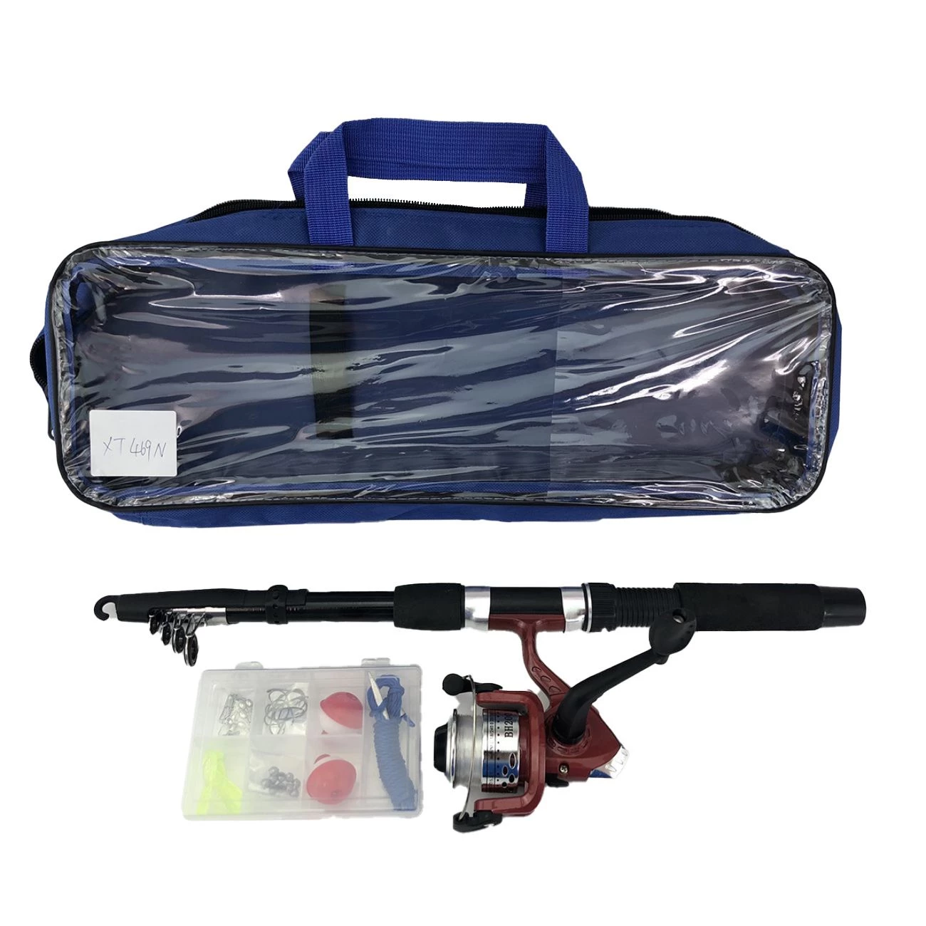 Ribiška palica, dolga 2,10 m, teleskopska palica (6 odsekov). ribiški kolut z navijanjem. Set dodatne opreme vsebuje: 2 plovca, 10 kavljev, 1 vrv, 10 uteži, 3 vabe in 5 ribiških karabinov. Material izdelave: fiberglas. Moč: 10-30 g.