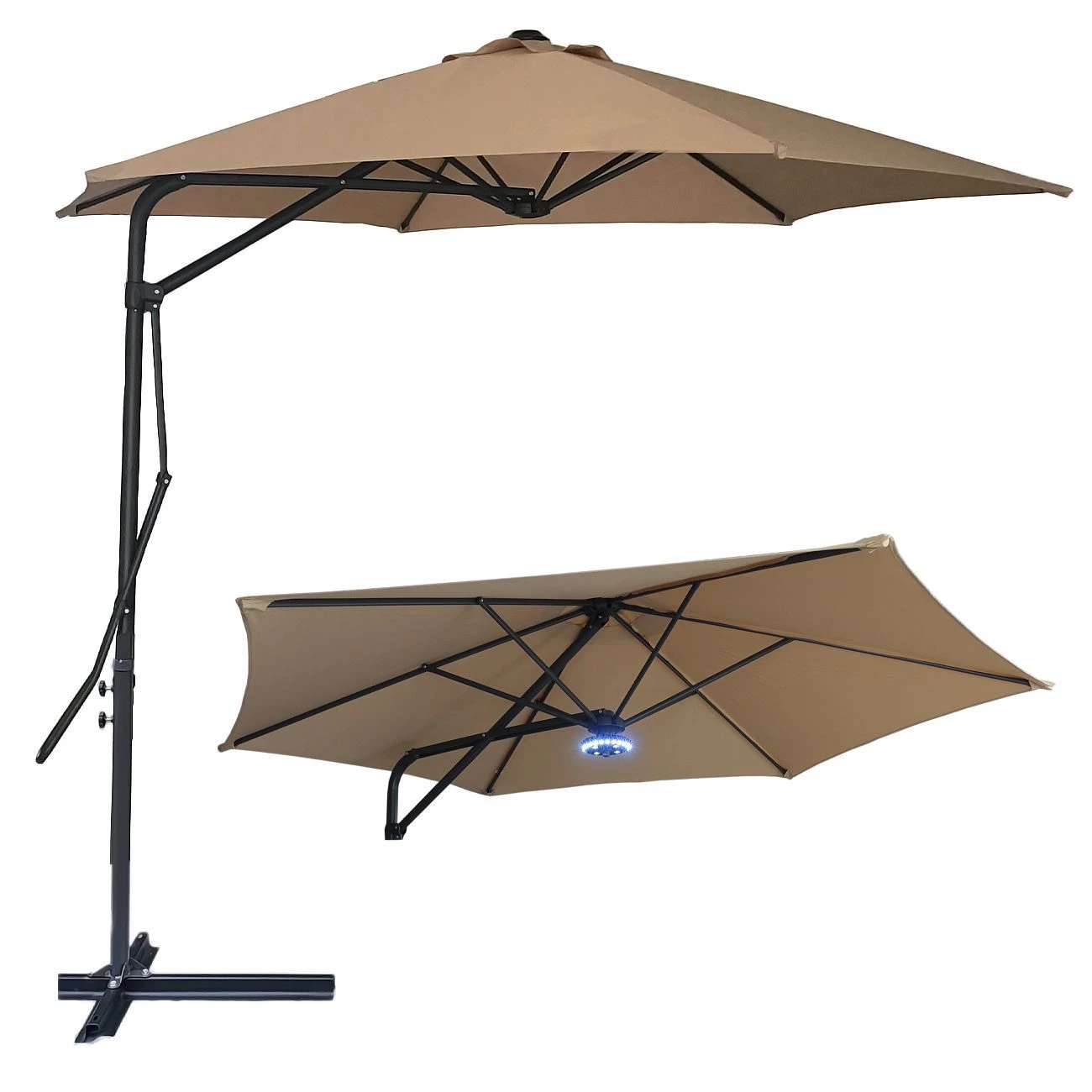 Senčnik z LED lučjo, višina senčnika 2,7 m. Premer jeklene podlage 42 mm 6 jeklenih palic 12x18 mm Poliesterska tkanina 180g/M2 s pokrivalom za zrak, zaščita od sonca UV50+. Baza 760 x 560 mm
