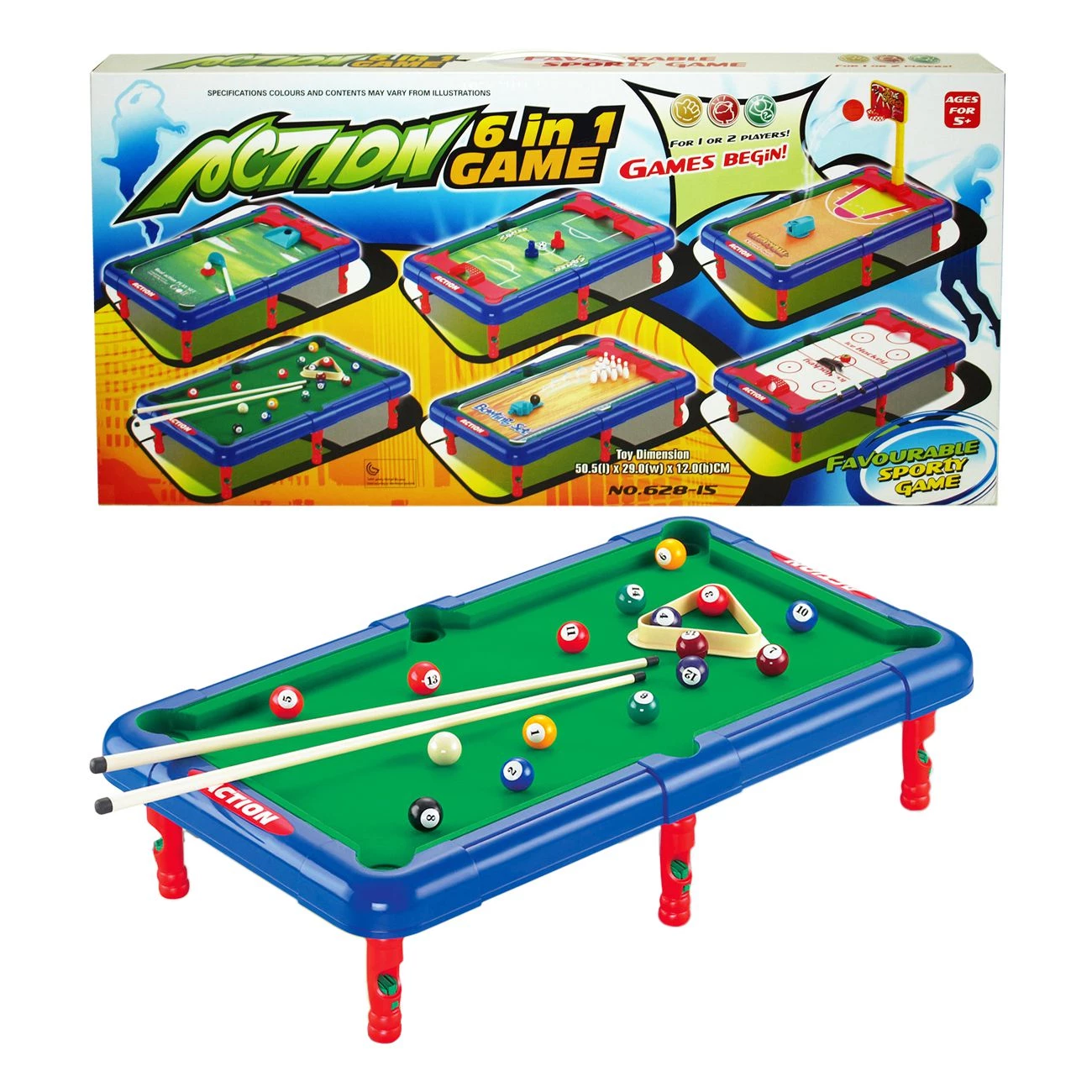 Set iger 6 v 1, skupna dimenzija 12 x 50,5 x 29 cm. Stojalo s spreminjajočimi podlogami za igranje 6 različnih zanimivih iger: nogomet, košarka, hokej, keglanje, biljard in golf. Primerno za otroke stare 5 let in več.