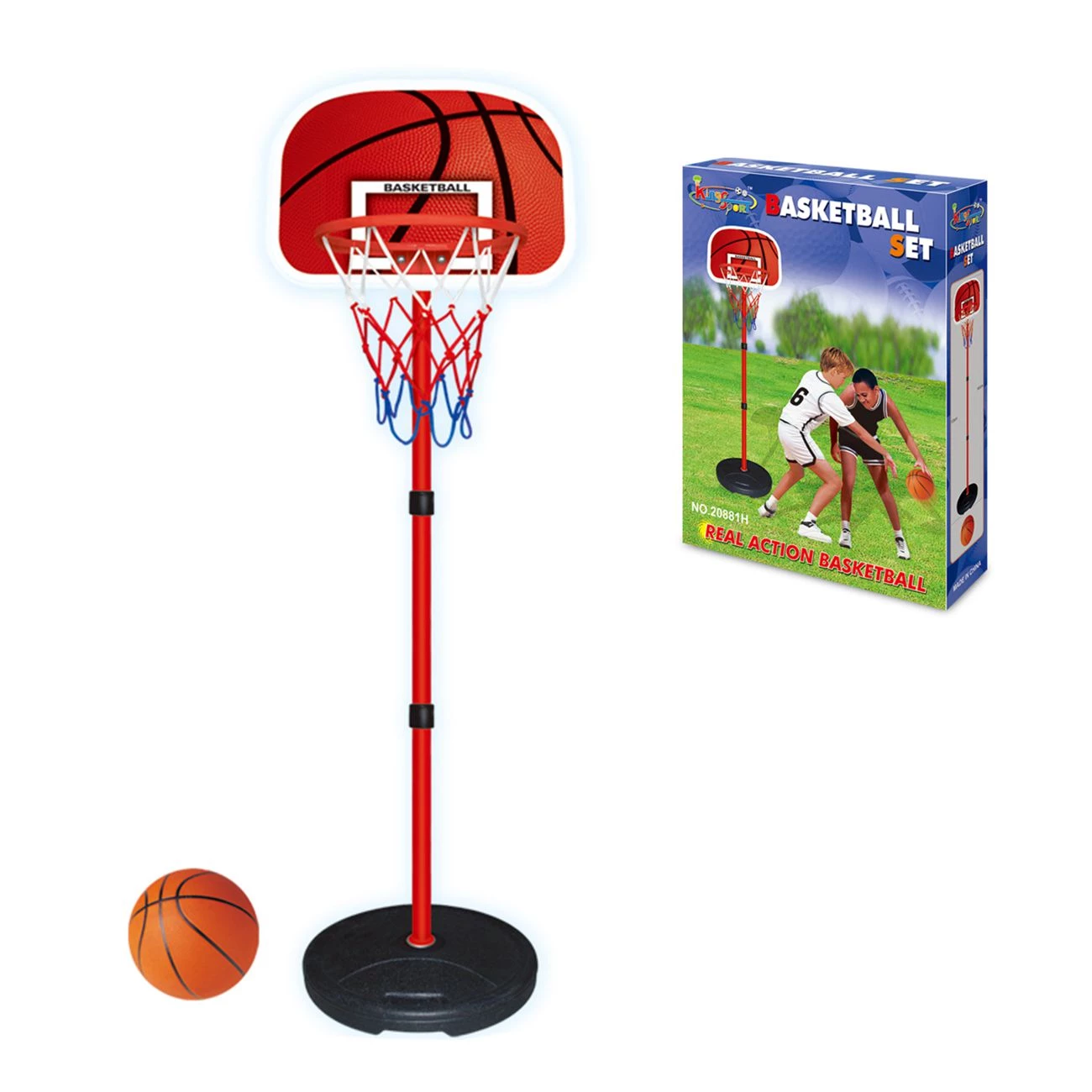 Košarkaški set 160 cm Višina droga 133 cm, velikost table: 46 x 32 cm Premer obroča: 26 cm, premer žoge: 15 cm Premer podstavka: 34 cm Primerno za otoke od 3 let dalje. Dimenzija pakiranja: 36 x 10 x 47,5 cm.