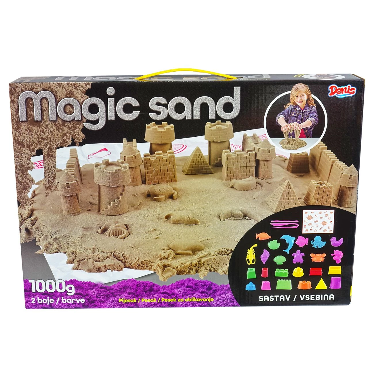 Set za igro s peskom. Vsebuje 2x500 gramov peska, s katerim lahko enostavno modeliraš. Izdelane skulpture odlično držijo obliko (se ne razsipajo). Pesek je v dveh barvah, z medsebojnim mešanjem dobiš novo barvo. Set vsebuje: 24 modelčkov, 3 nožke za rezanje in oblikovanje mase, ter pvc podlogo 32x42 cm. Primerno za otroke stare 3 leta in več.
