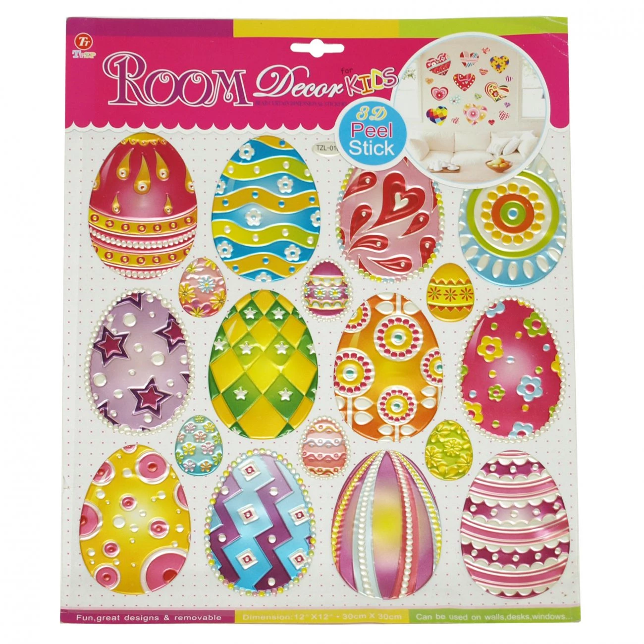 Samolepilne nalepke za steklo in druge gladke površine. Potrebno jih je nežno nalepiti in odstraniti (za večkratno uporabo). Set vsebuje: 3D nalepke v obliki jajca - 12 kom vel. 9 x 6,5 cm in 6 kom vel. 3,5 x 2,8 cm.