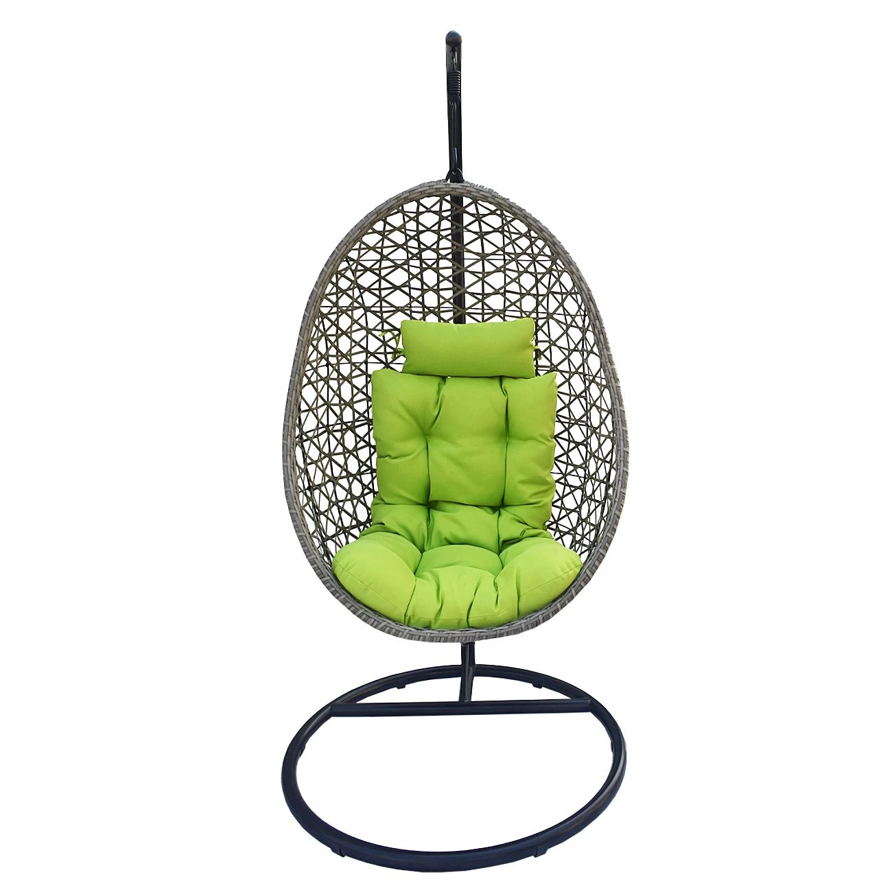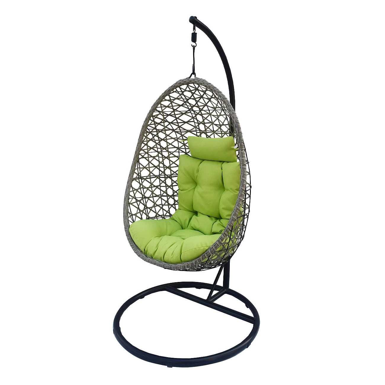 Viseči fotelj z zeleno blazino, na jeklenem stojalu. Nosilnost teže do 130 kg. Dimenzije fotelja: 119x82x62 cm. Izdelano iz plastificiranih jeklenih cevi in umetnega ratana. Blazina je iz poliestra. Dimenzije stojala 194x94 cm. Izdelano iz plastificiranih jeklenih cevi. Transportne dimenzije: 70 x 94 x 190 cm. Transportna teža: 23,9 kg.