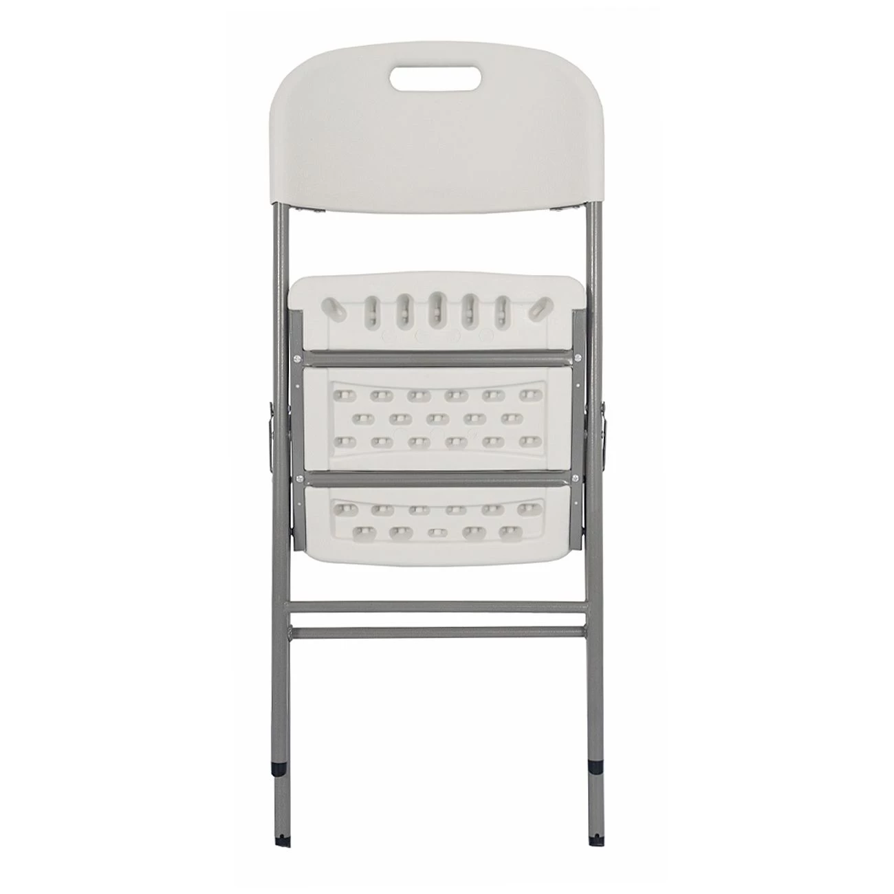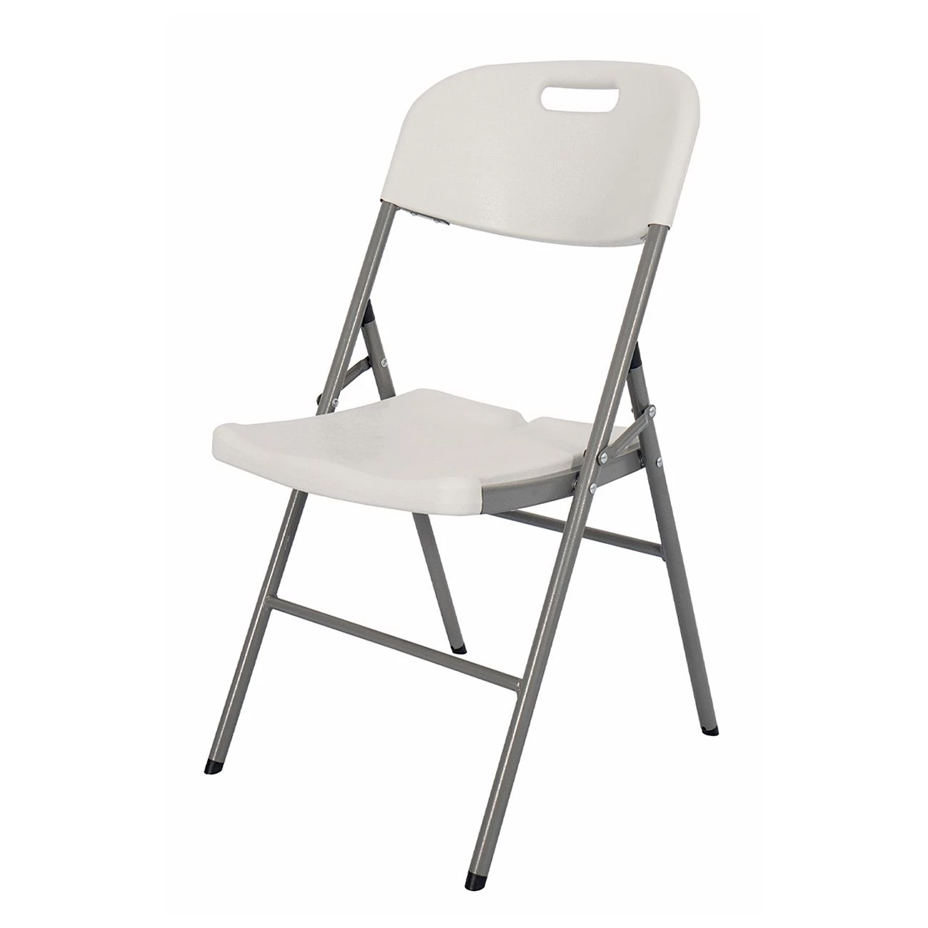Zložljiv stol, bel, dimenzije 44x50x84 cm. Železna konstrukcija, premer cevi 19 mm. Material sedeža: 4 cm debela plastika. Transportne dimenzije: 113x22x47 cm, teža 18 kg.