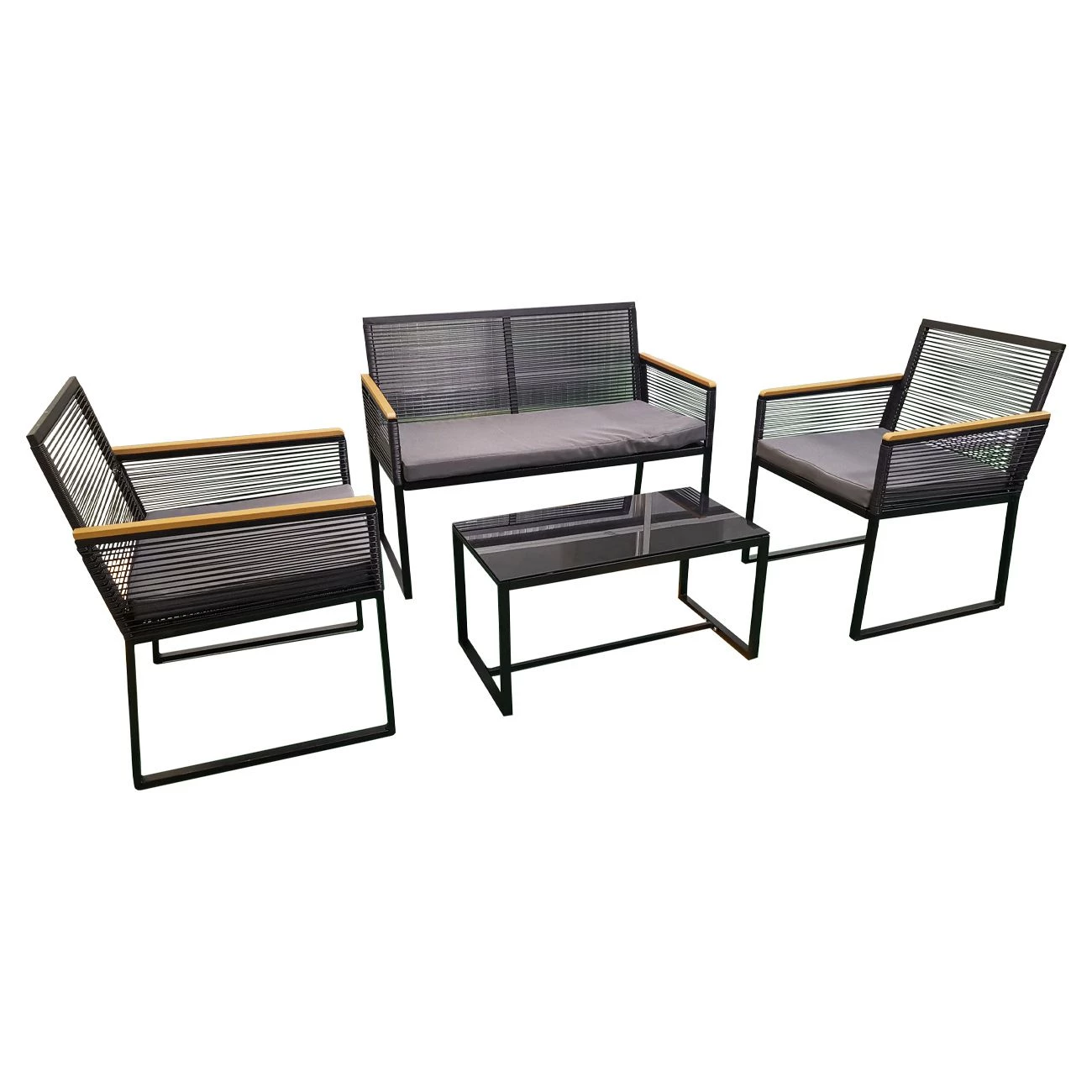 vrtni set 4 delni. Set vsebuje mizo velikosti 80x45x35 cm, Dva stola 60x66x78 cm in dvosed 110x66x78 cm. Miza ima 5mm steklo. Oblazinjen del je iz poliestra. Ogrodje iz aluminijastih cevi.