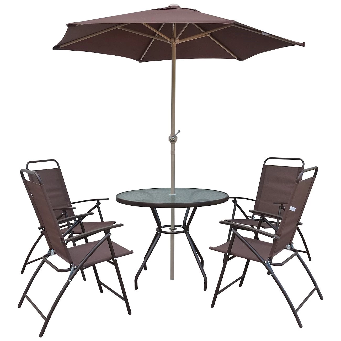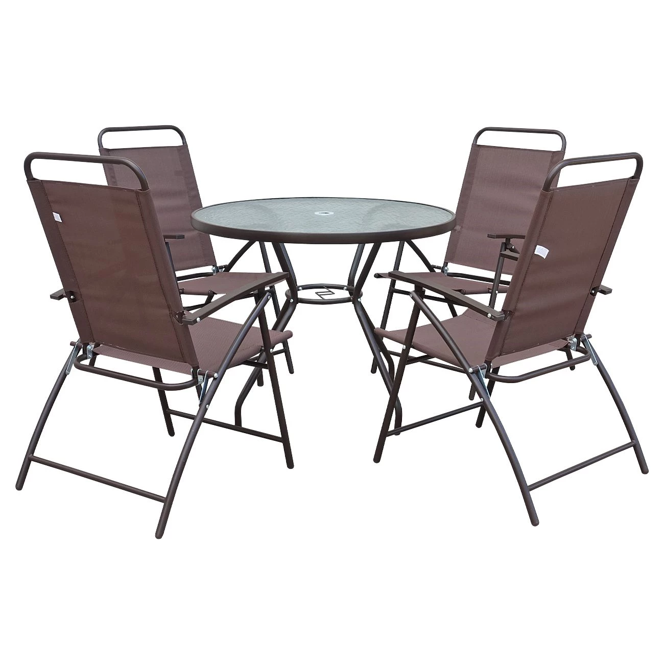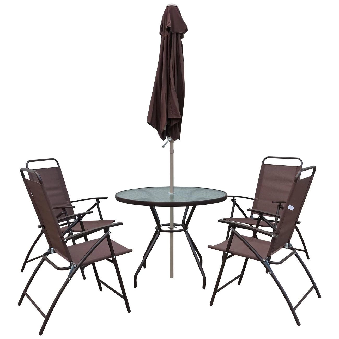 Vrtna garnitura, sestavljena iz mize, štirih stolov in senčnika. Dimenzija mize: višina 70 cm, premer 90 cm. Velikost dežnika: 180X190 cm. Dimenzije stola: 63X56X96 cm. Transportne dimenzije: 114x19x94 cm, teža 32 kg.