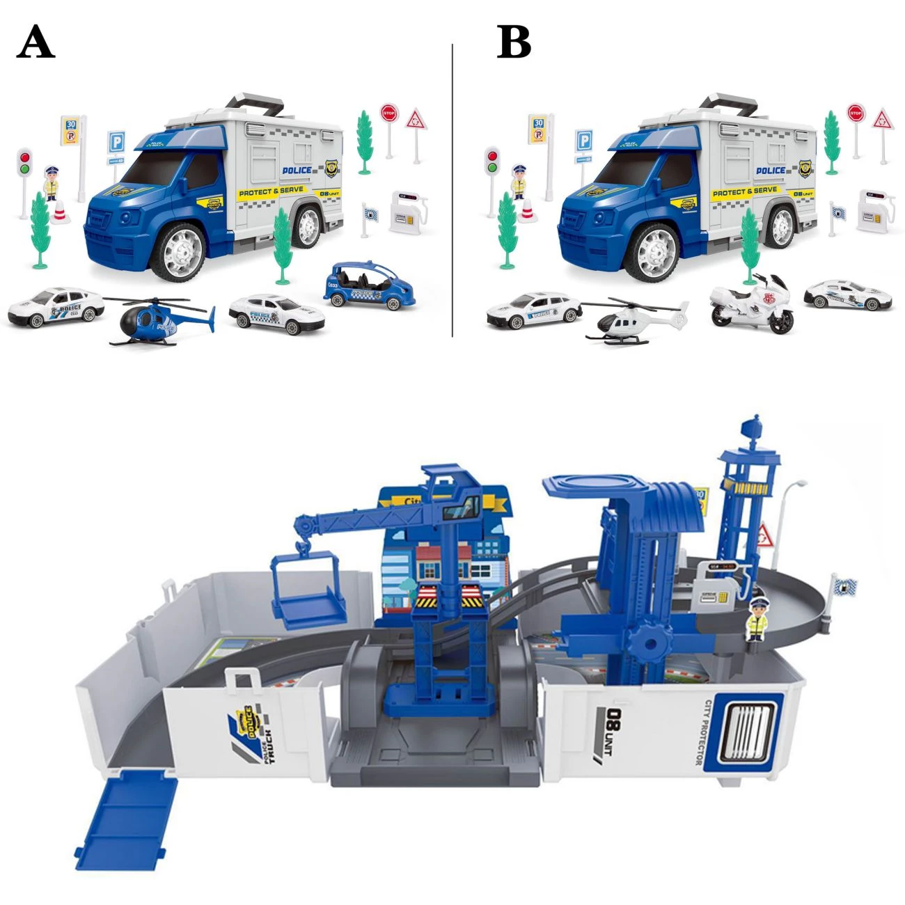 Podaj se na skrivno akcijo z veličastnim policijskim tovornjakom, ki skriva pravo presenečenje. Velik tovornjak se odpre in spremeni v pravo garažno hišo, z razglednim stolpom, dvigalom za vozila in posebno dirkalno stezo. V kompletu dobiš še različne prometne znake, drevesa in 4 vozila (helikopter, avtomobile in motor). Velikost tovornjaka 42 cm in ima tudi ročaj za lažje prenašanje. Primerno od 3 let dalje.